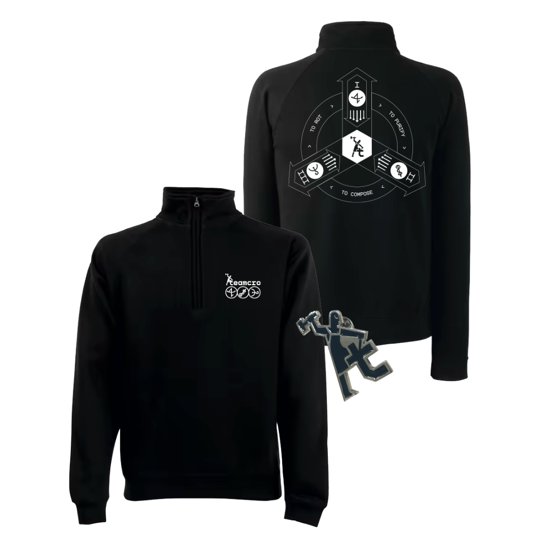 Il bundle ufficiale TEAMCRO composto da felpa e spilla, realizzato per accompagnare la nuova fase del progetto con un design essenziale e curato nei dettagli.